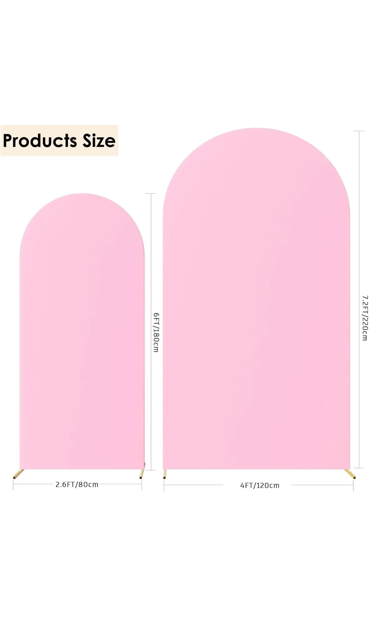Rent our gold metal arch backdrop set for your next party! The rental comes with 2 arches, (7.2ft and 6ft) and choice of white, pink or blue slip cover.