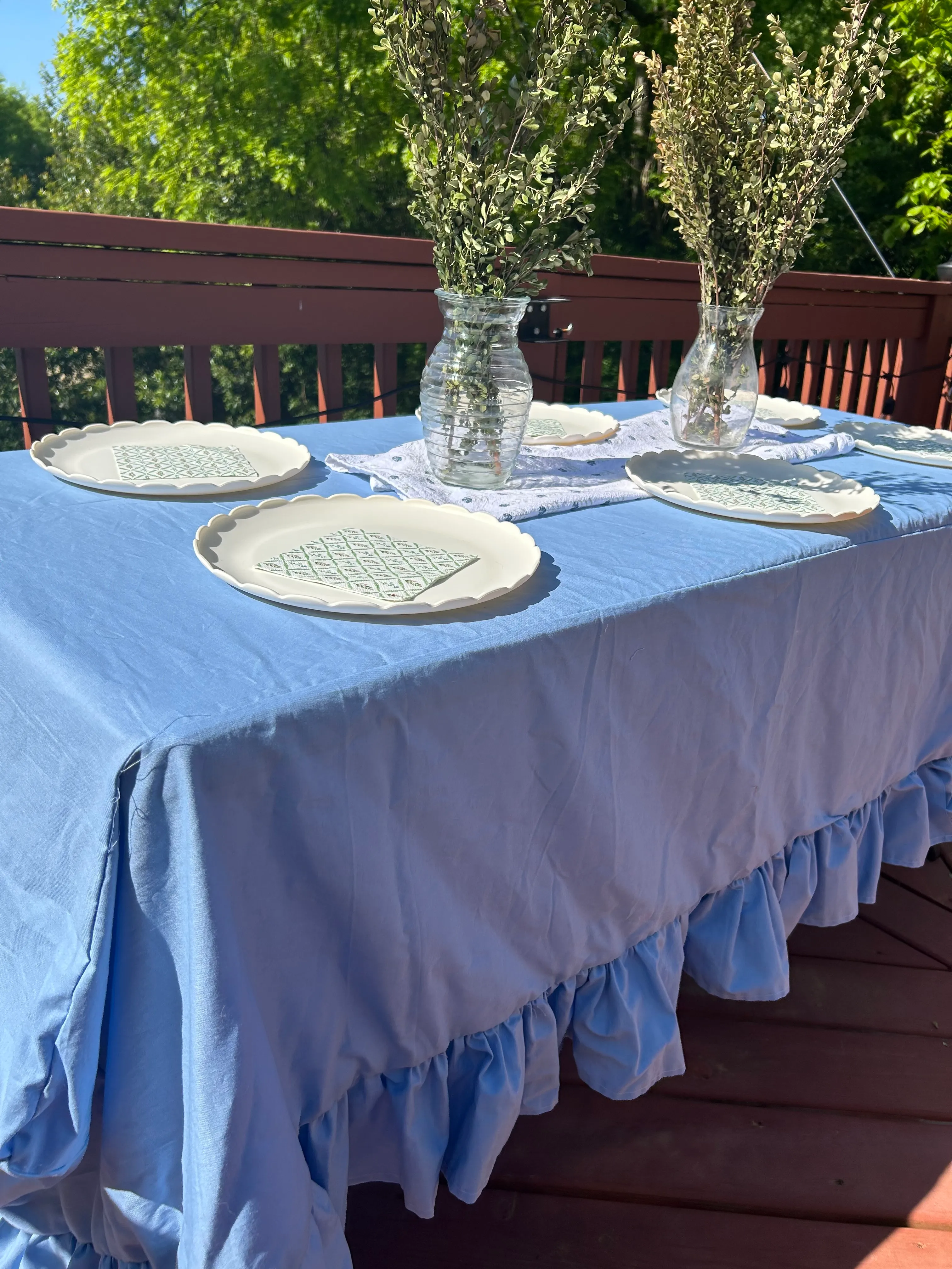 Each table cloth is 6ft long and fits our kids tables to be floor length or can fit and adult table to be mid length!